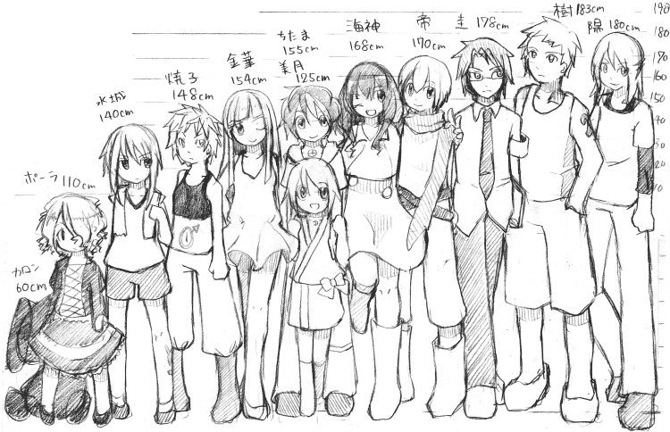 キャラが増えると身長差がワケわかんなくなってくるので、ずらっと並べてみました。